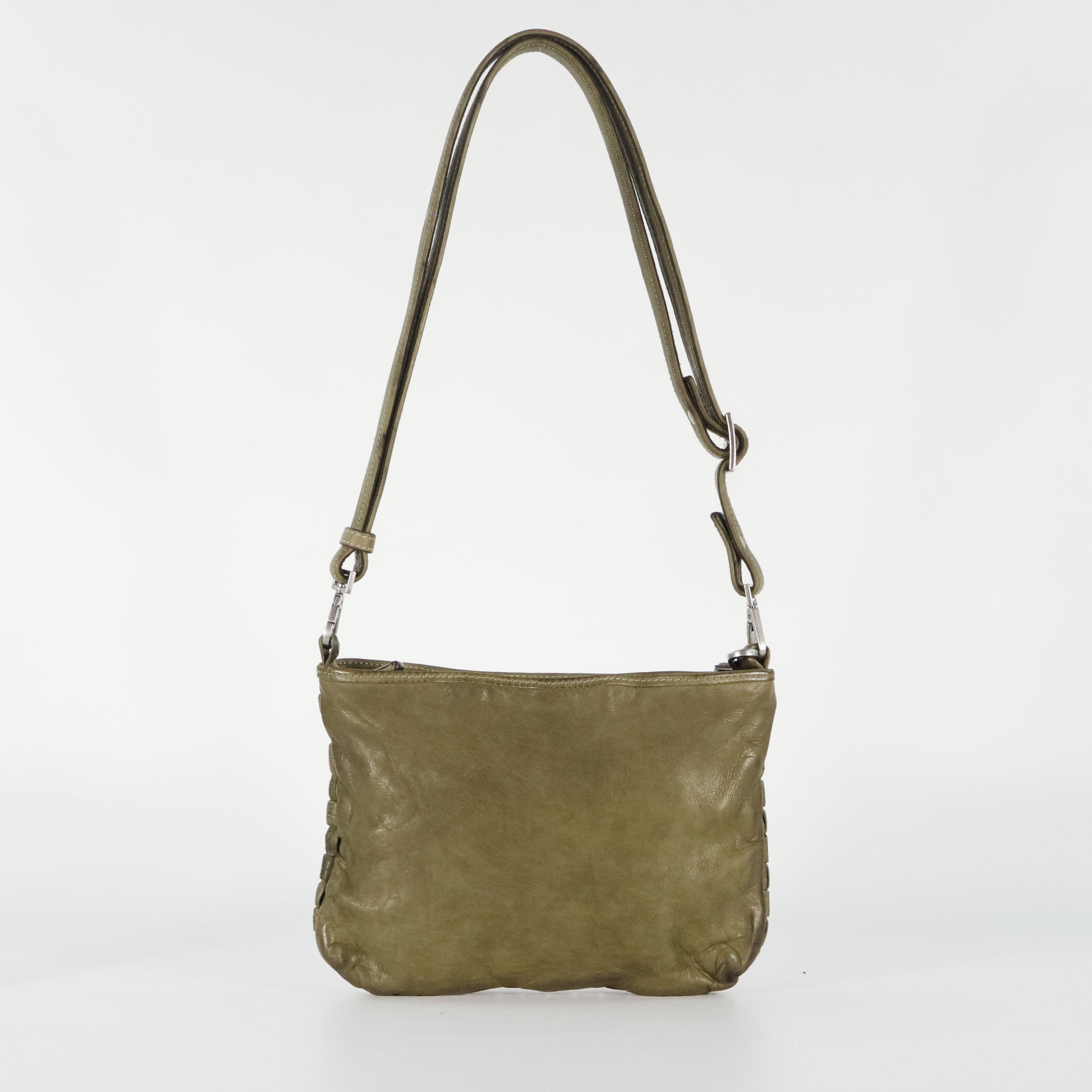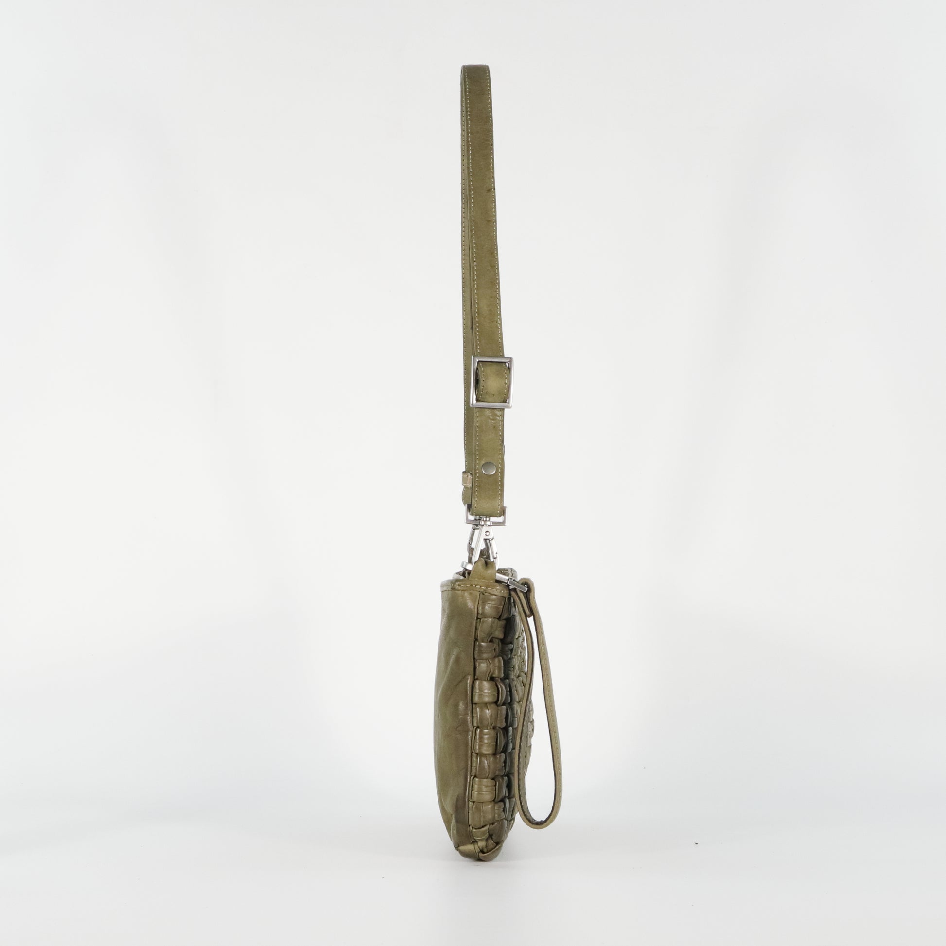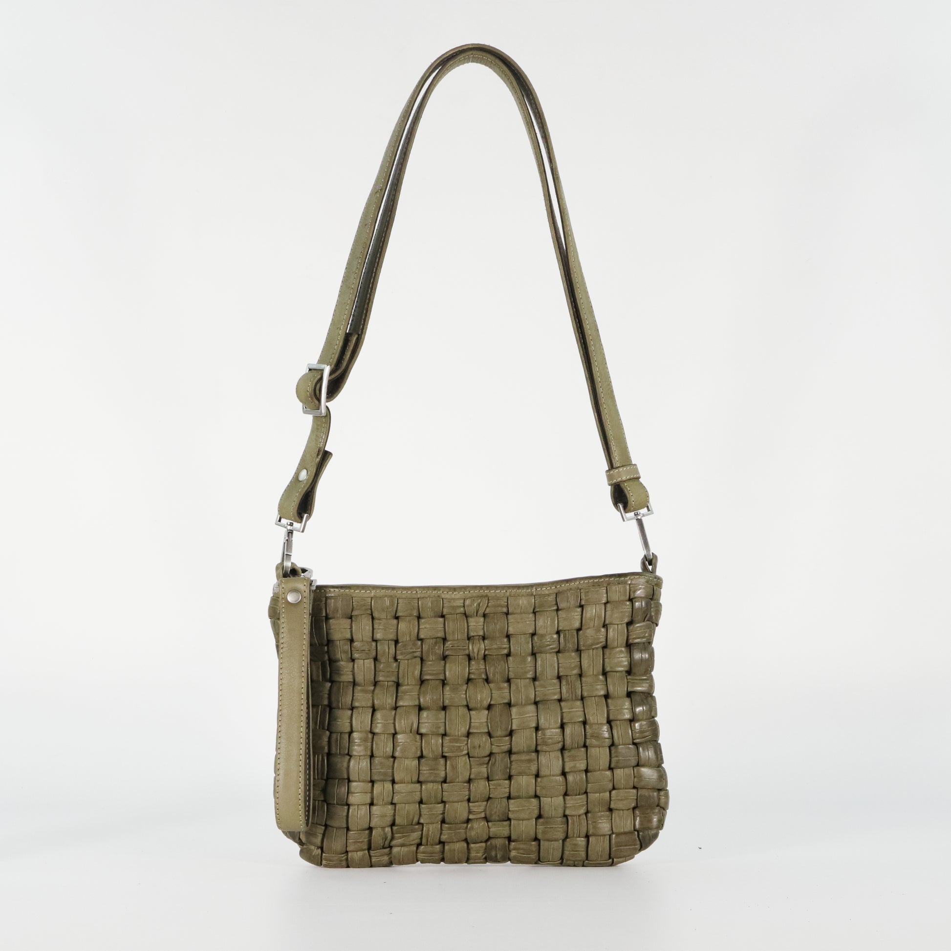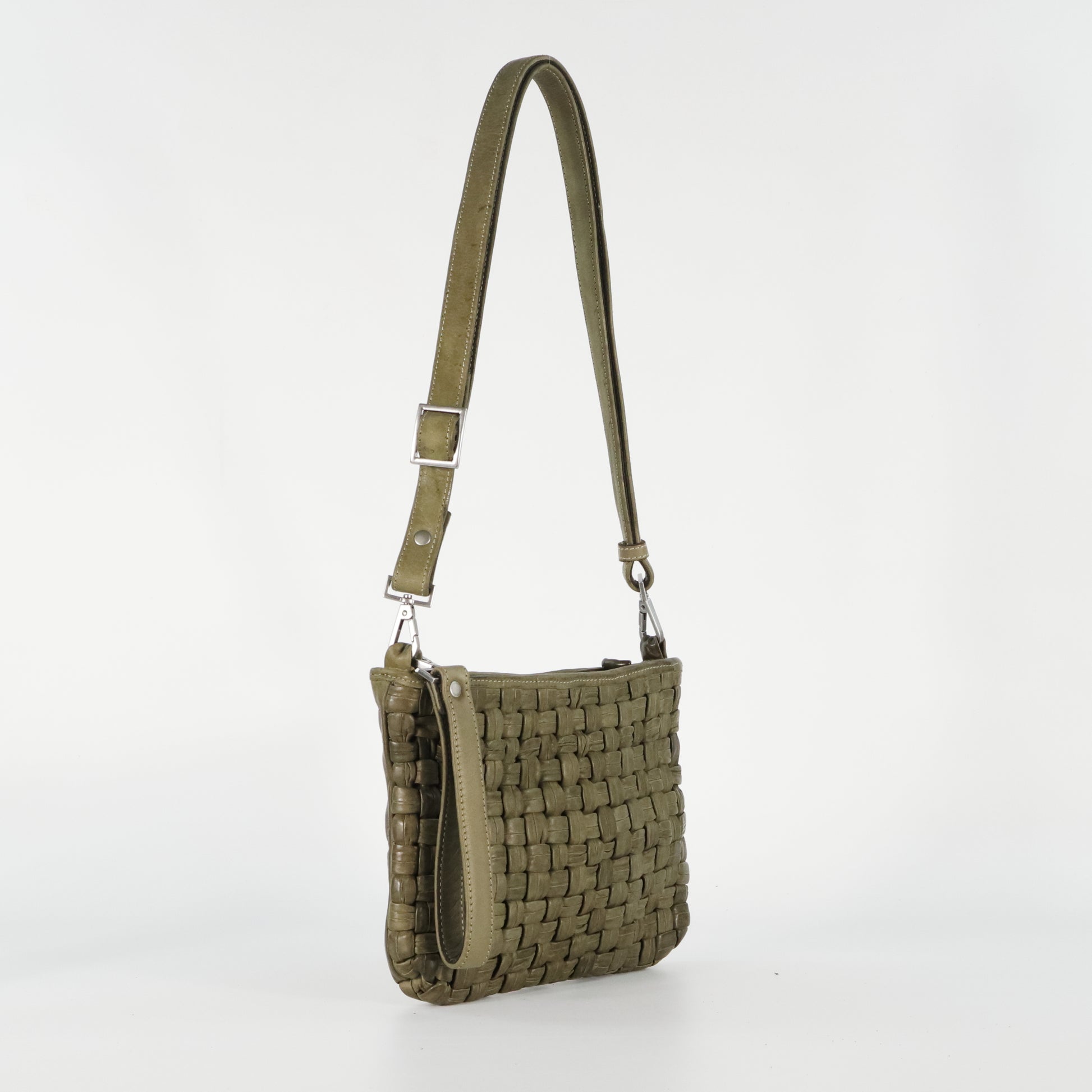 A unique woven bag crafted from tubular leather strips for a distinctive textured look. With an adjustable, removable strap, secure zip closure, and organized interior, it blends artisanal style with everyday practicality