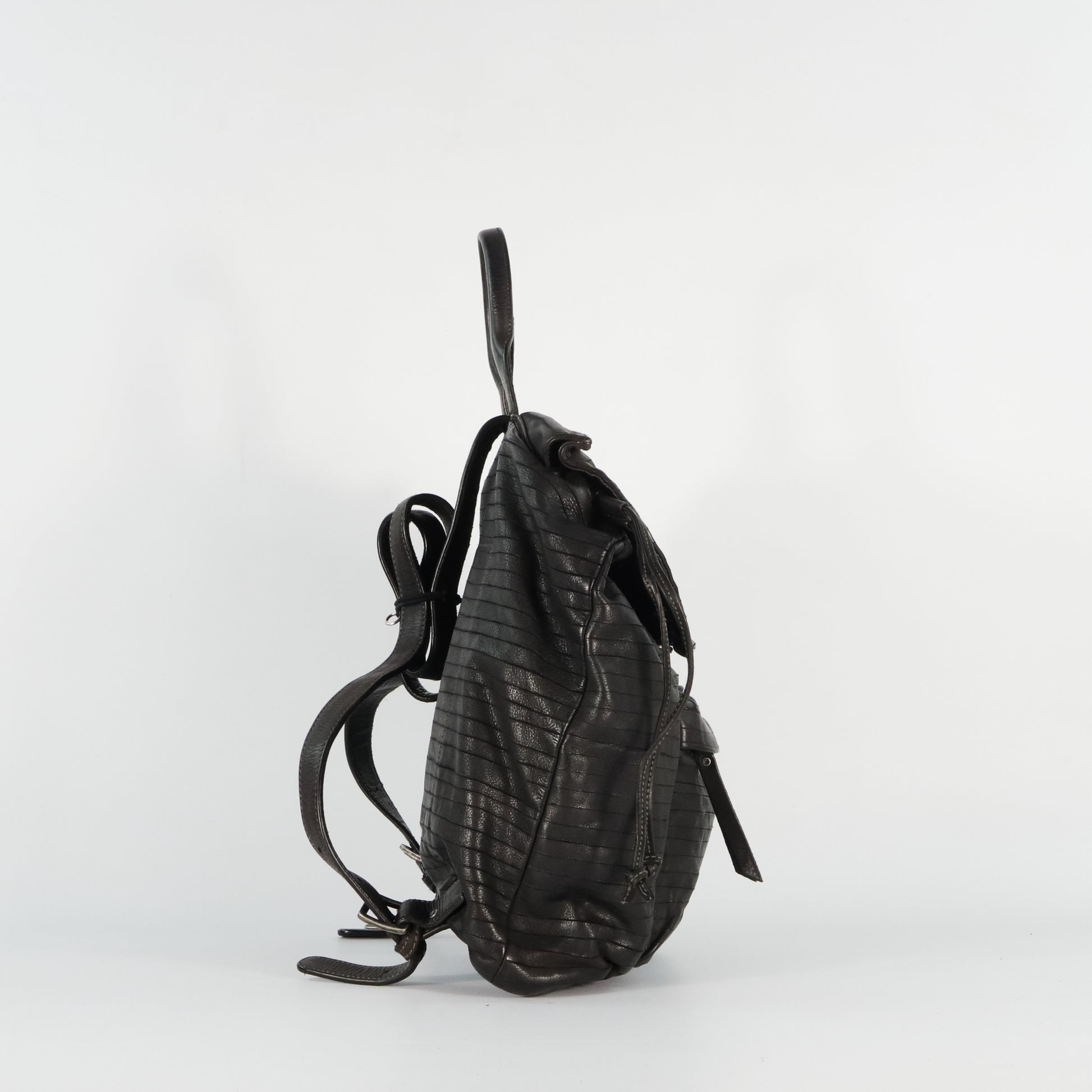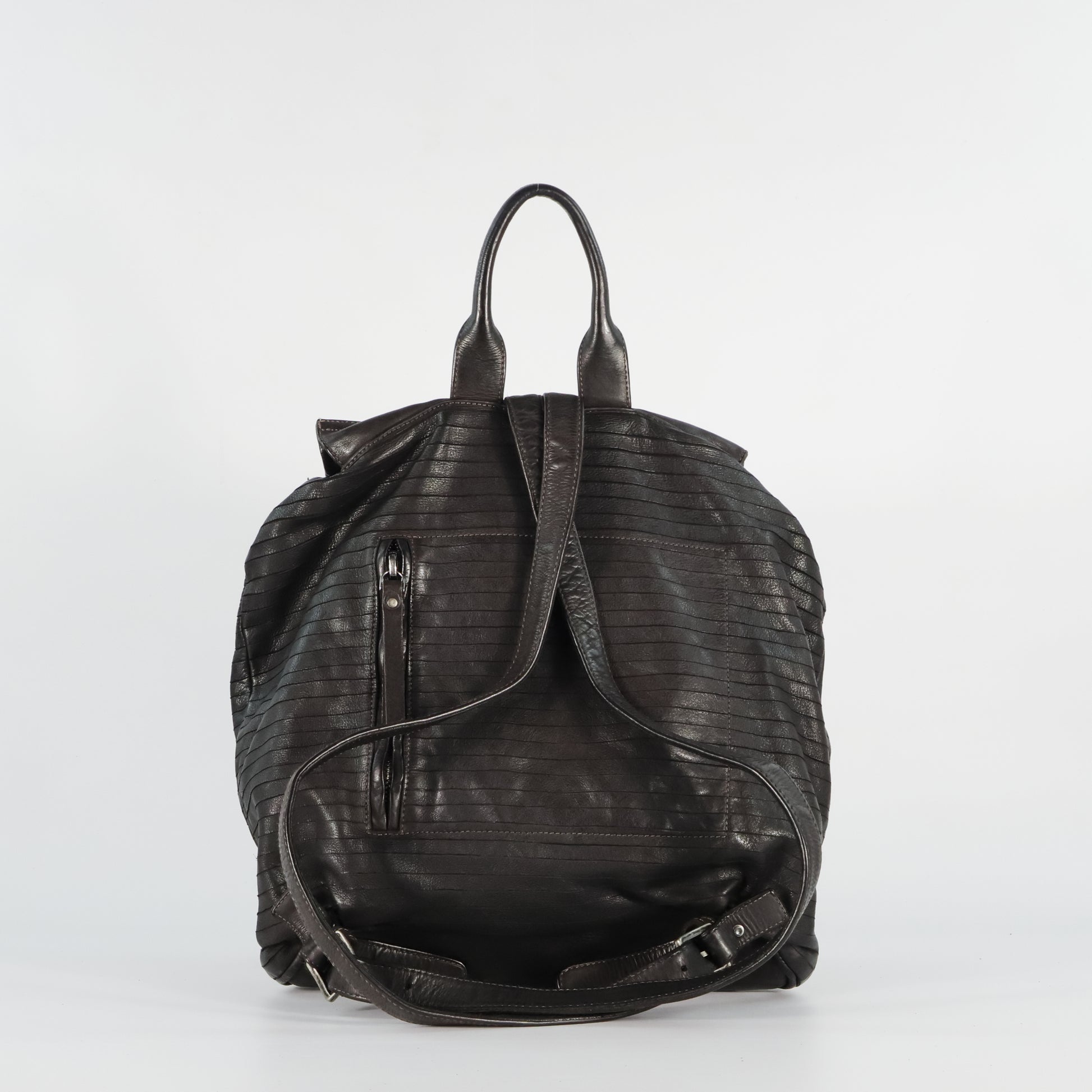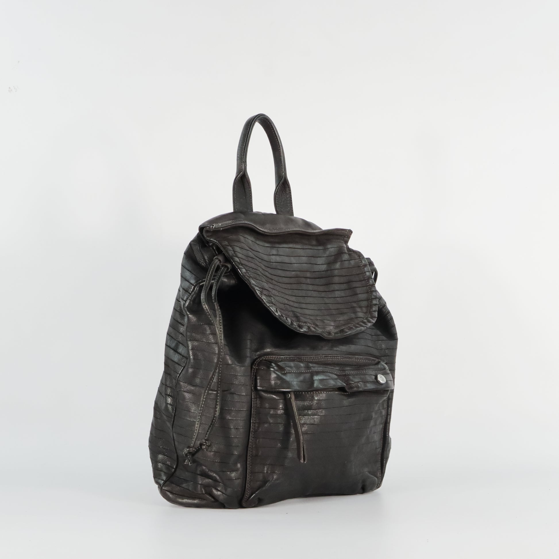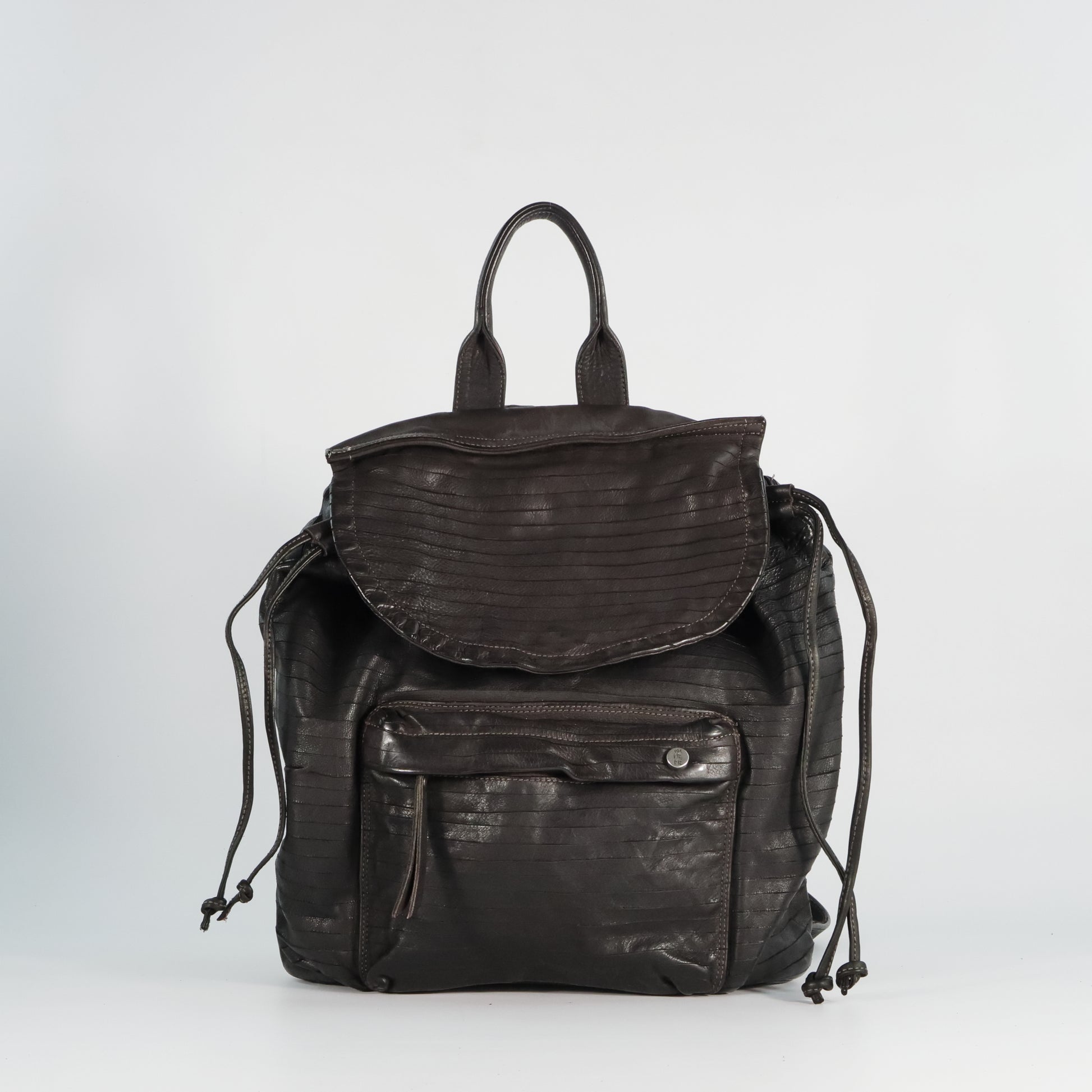 Backpack, featuring horizontal cut-out stripes that enhance its texture. It has a flap and drawstring closure, a front pocket with zip and snap button, adjustable shoulder straps, and a top handle. The interior is cotton-lined and includes zip compartments for better organization. Essential and contemporary style, ideal for everyday use.