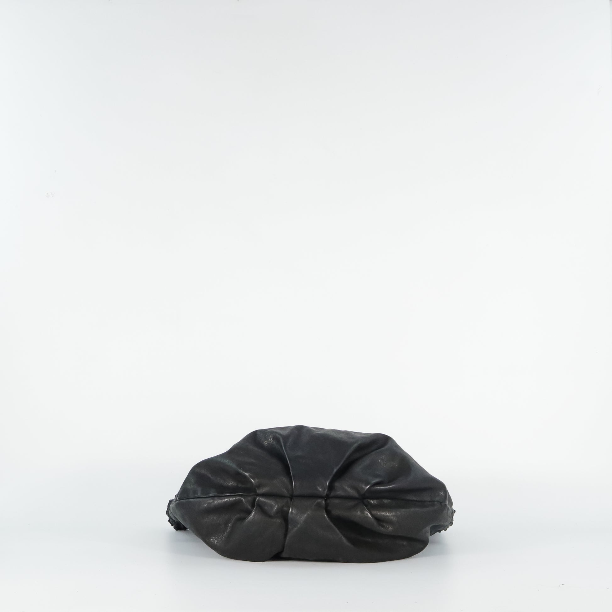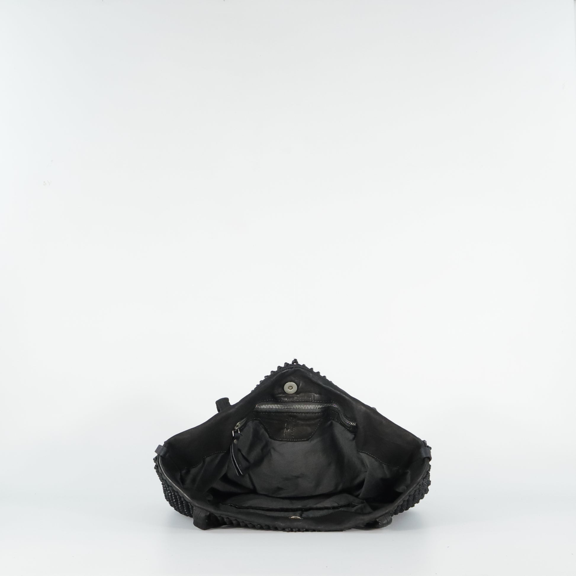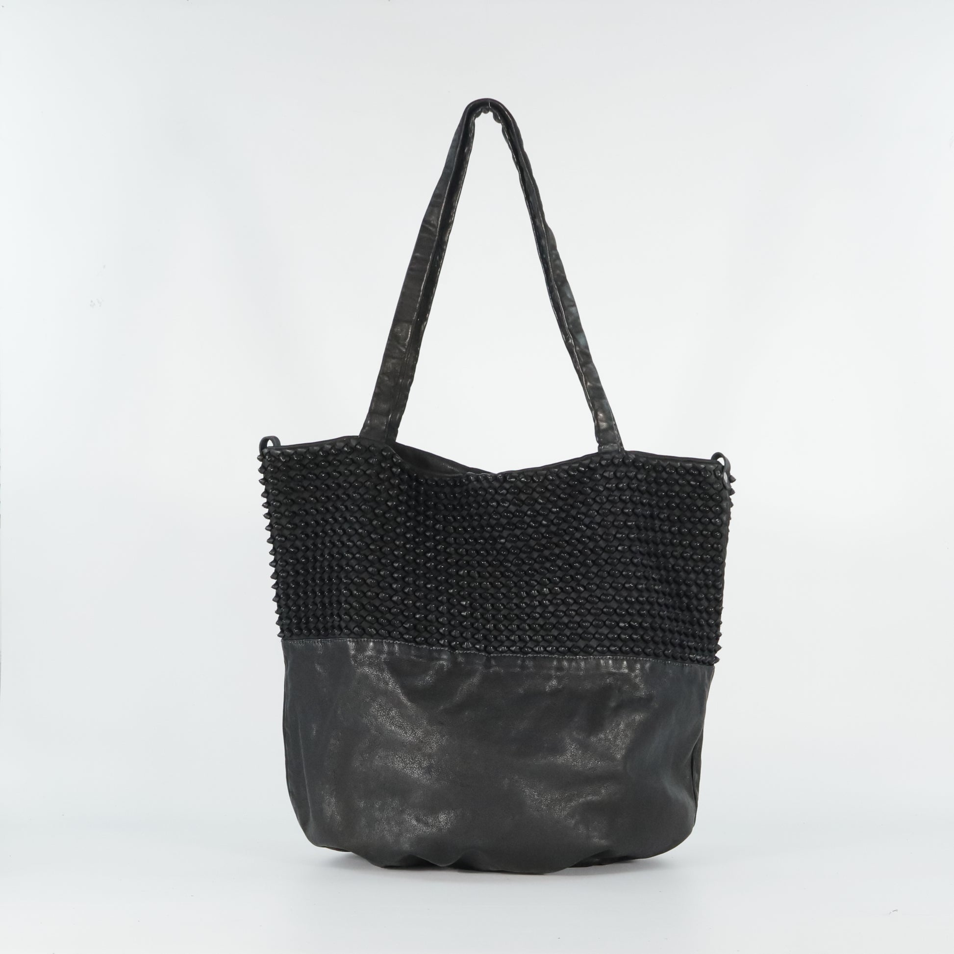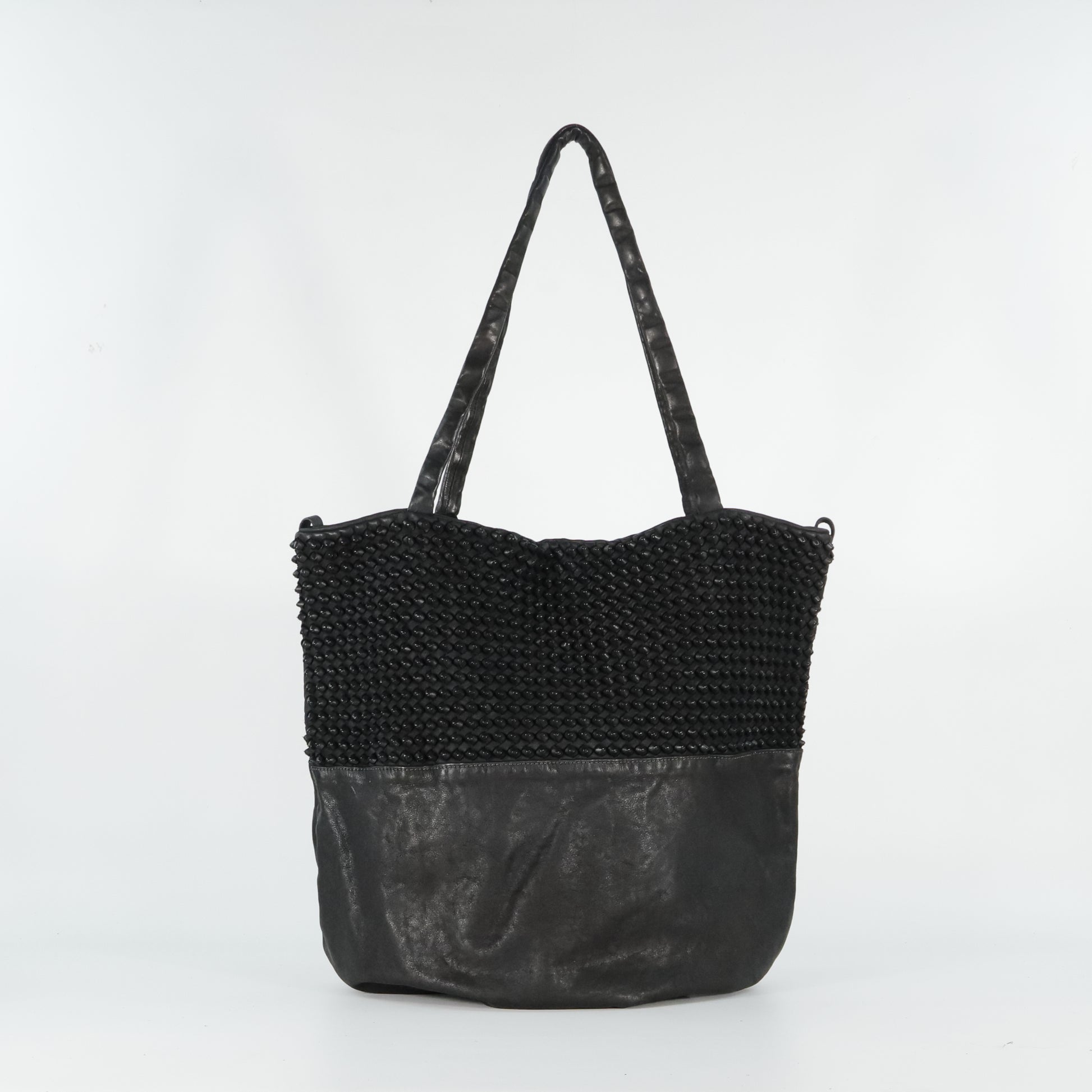 A black leather shopper featuring a distinctive weave of small knots on the upper part. Equipped with double handles for shoulder carry and an adjustable, removable strap. The lined interior includes pockets and a magnetic button closure. Spacious, practical, and elegant, it combines artisanal details with a contemporary style.
