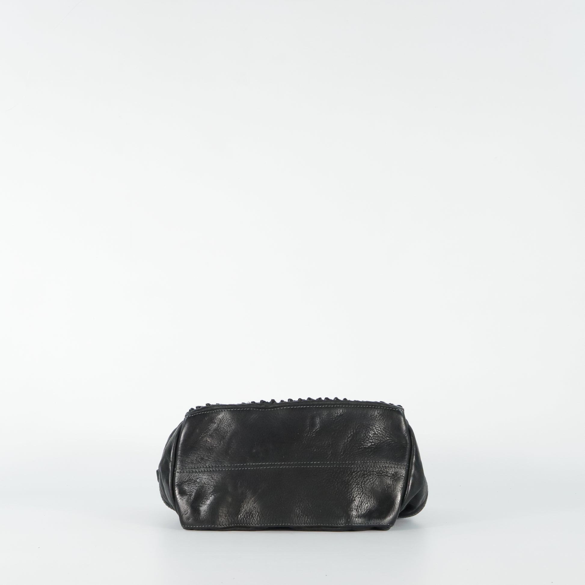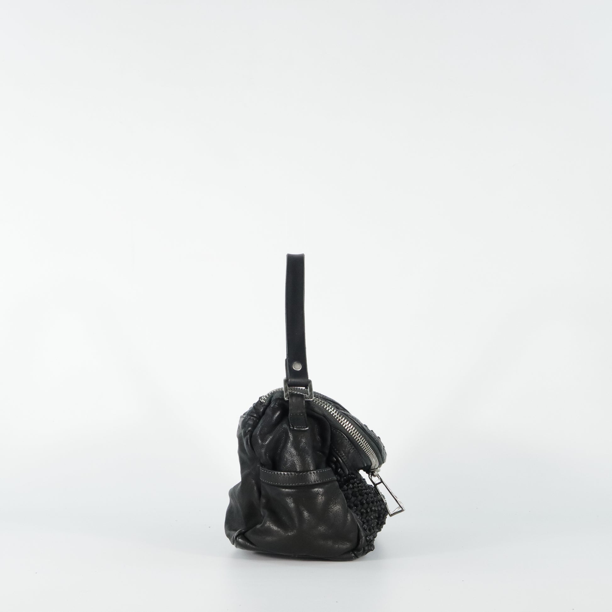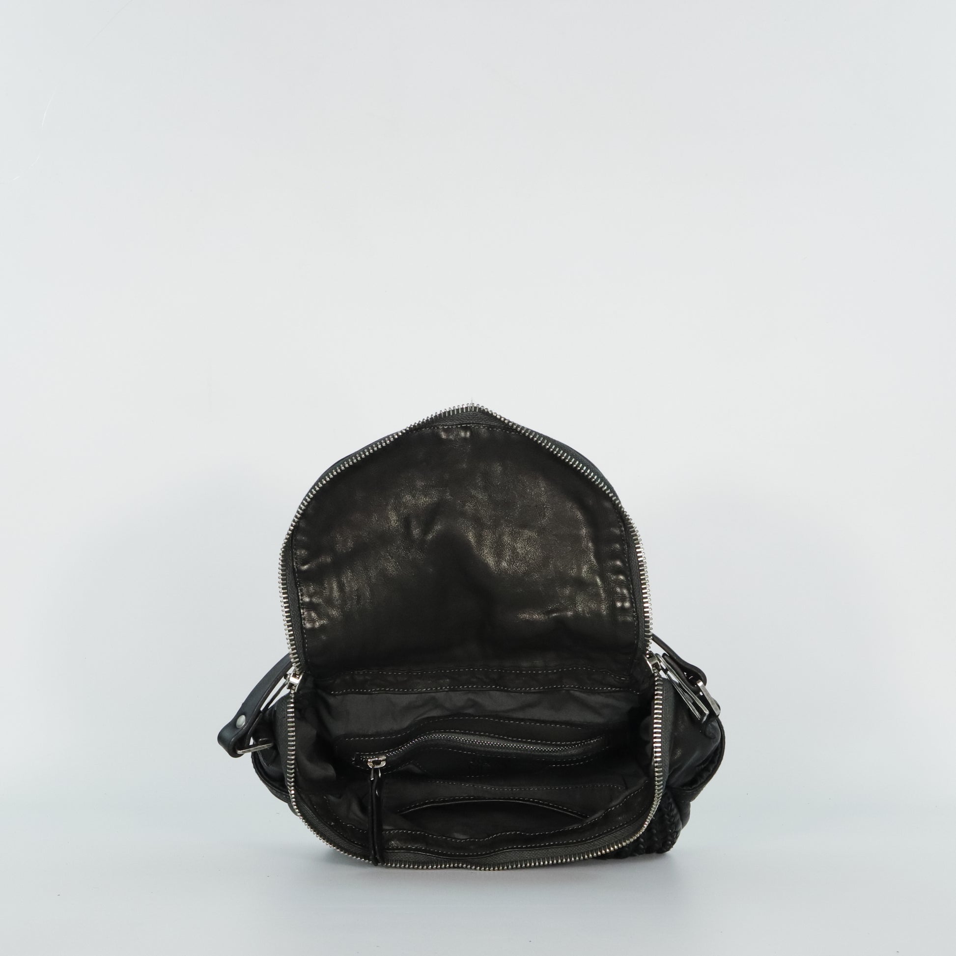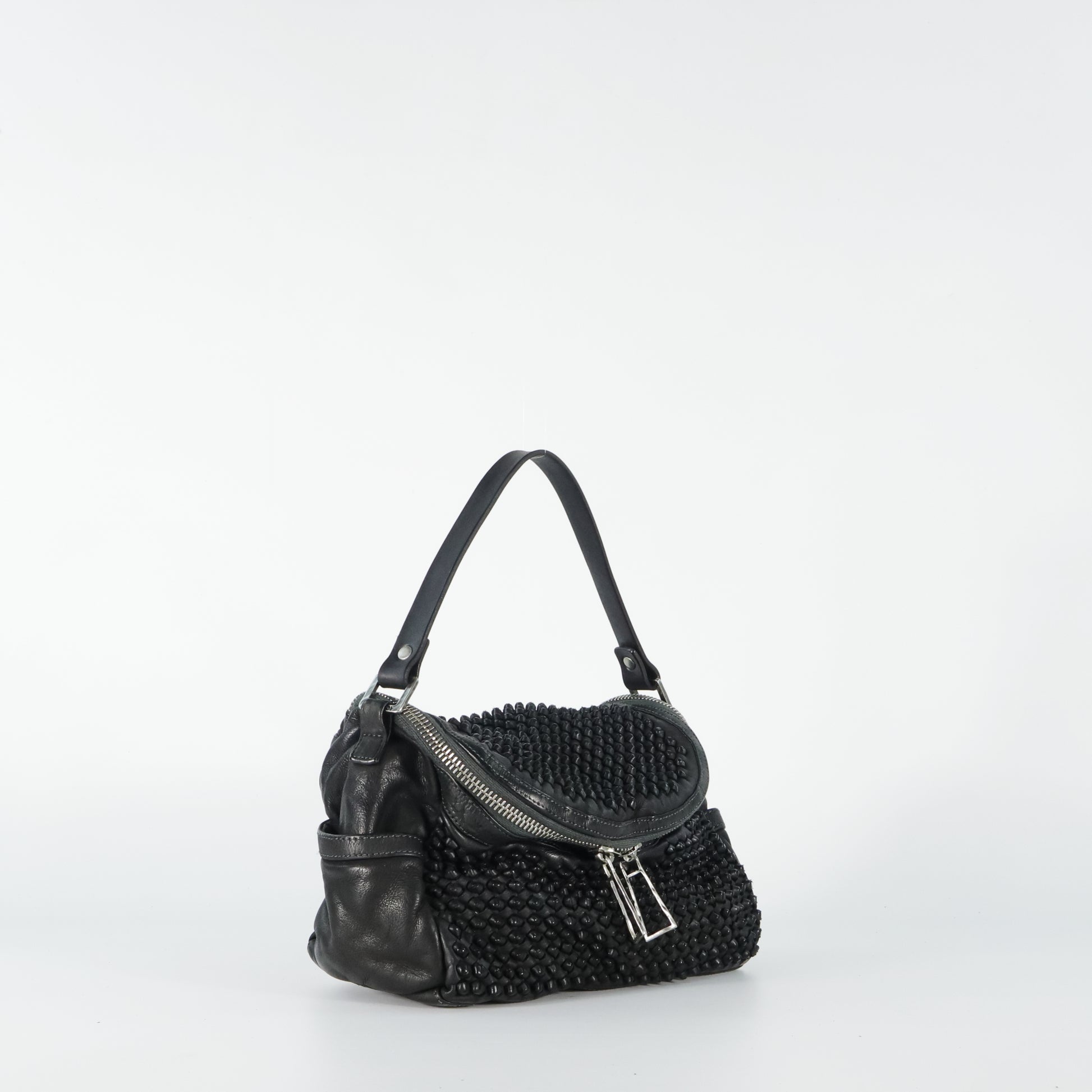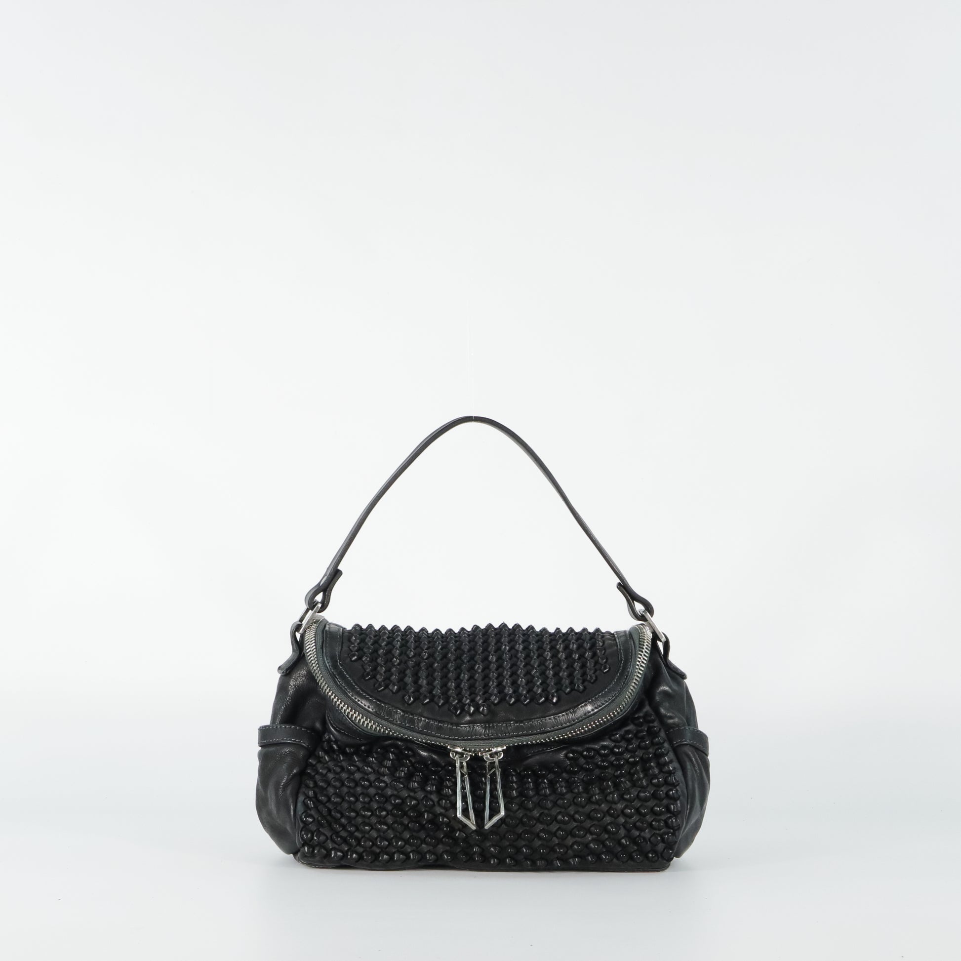 Priscilla features a distinctive weave of small leather knots on the front. Equipped with a top handle, adjustable and removable shoulder strap, double-slider zip closure, and a lined interior with pockets. An artisanal yet contemporary style.