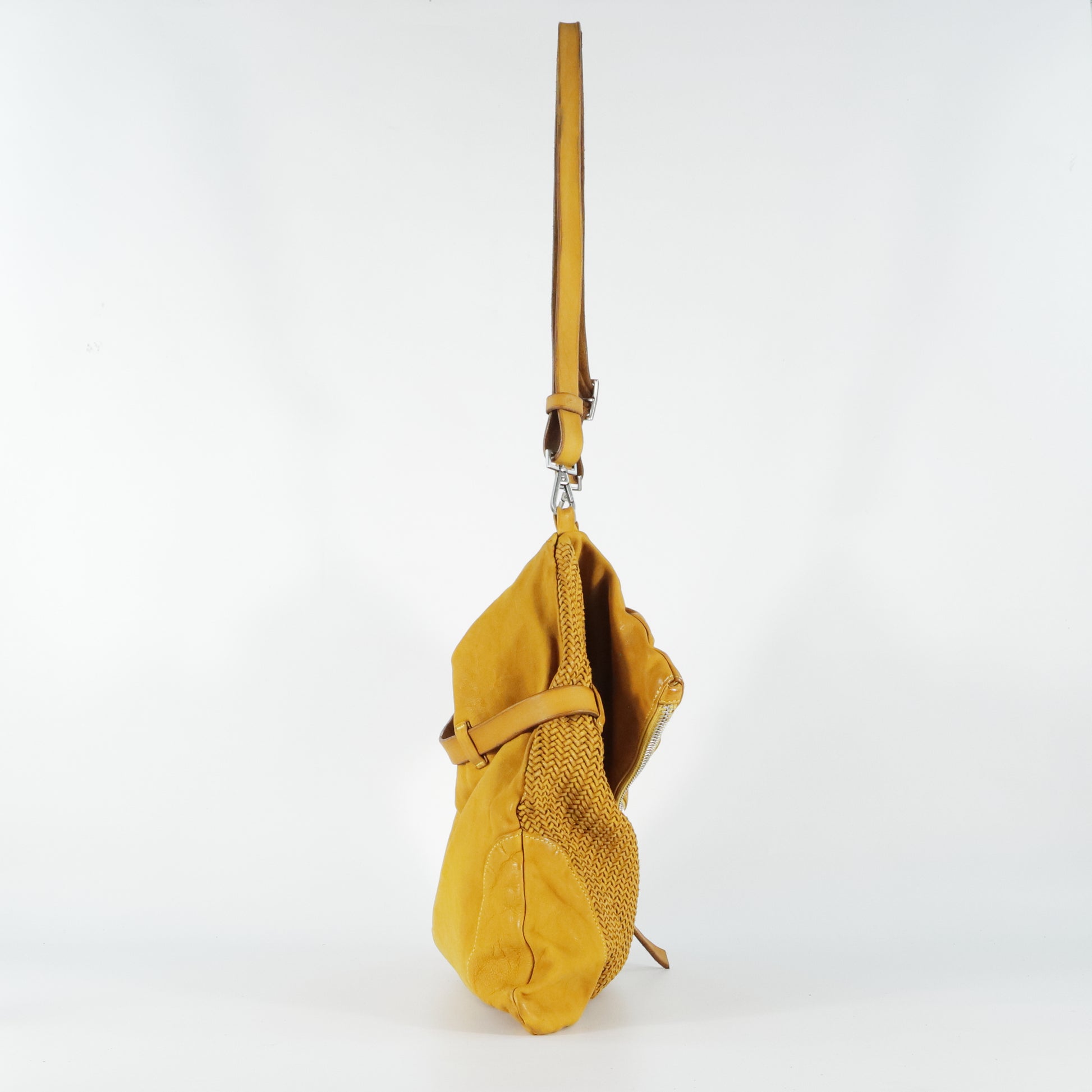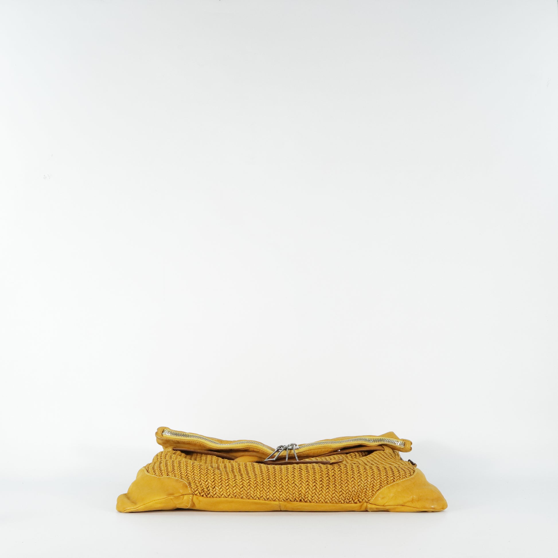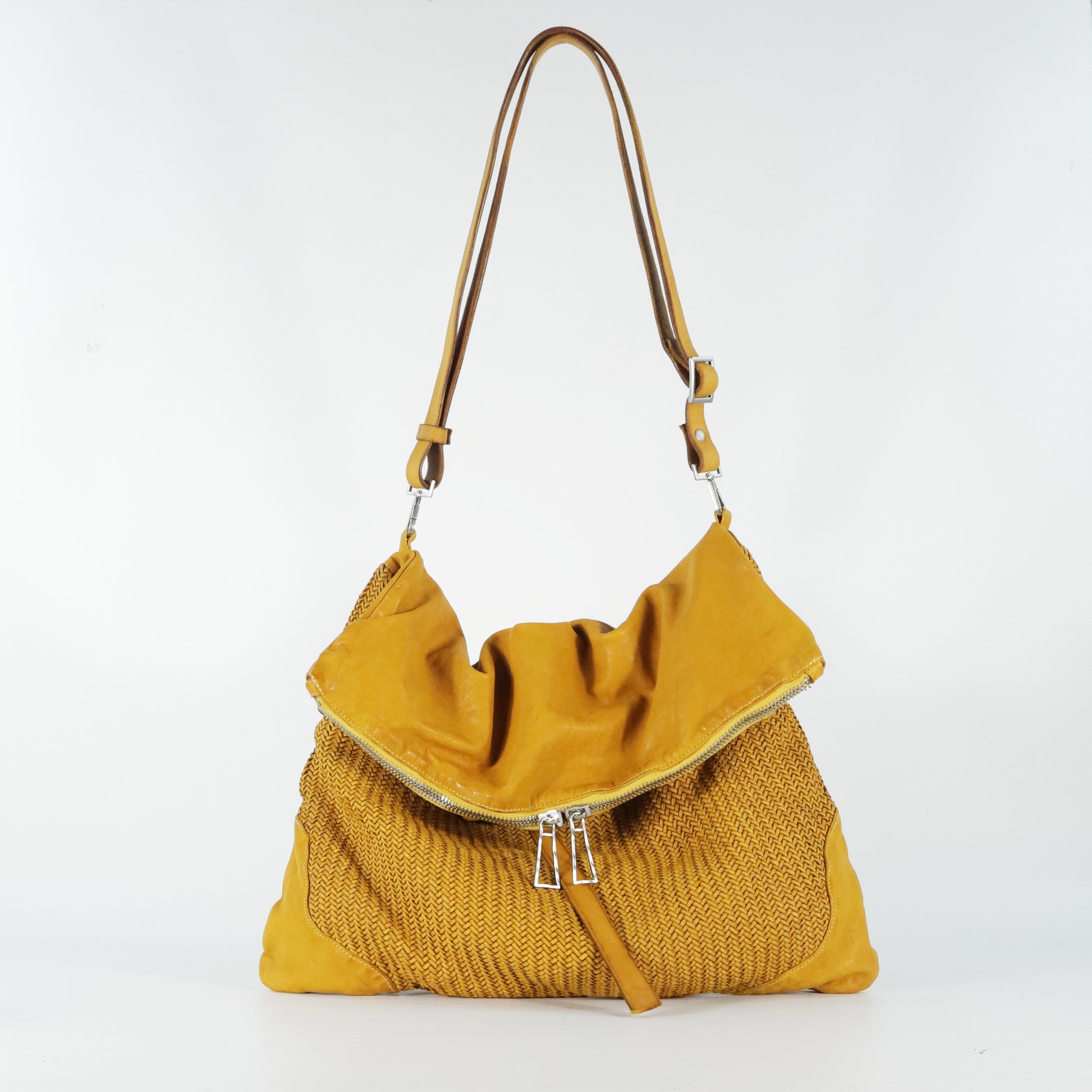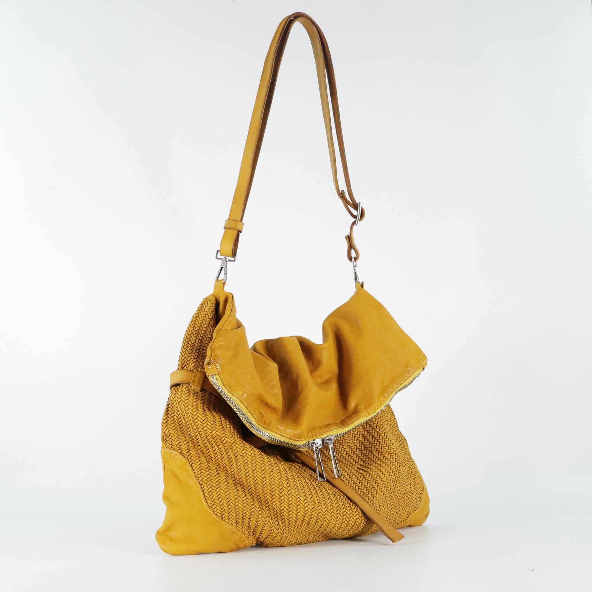 Defined by a micro herringbone weave on the front panels. Featuring a soft design with a folded flap and double zip closure. Equipped with an adjustable shoulder strap and a lined interior with pockets. Practical and spacious, it adds an artisanal and contemporary touch to any look.